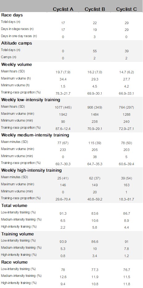 A summary of the training and racing data has been outlined in Table 2. The average training volume was about 15-20 hours/week, with individual weeks reaching almost 35 hours, meaning that the cyclists did not adopt exceptional training volumes when compared to training diaries from other professional cyclists.4