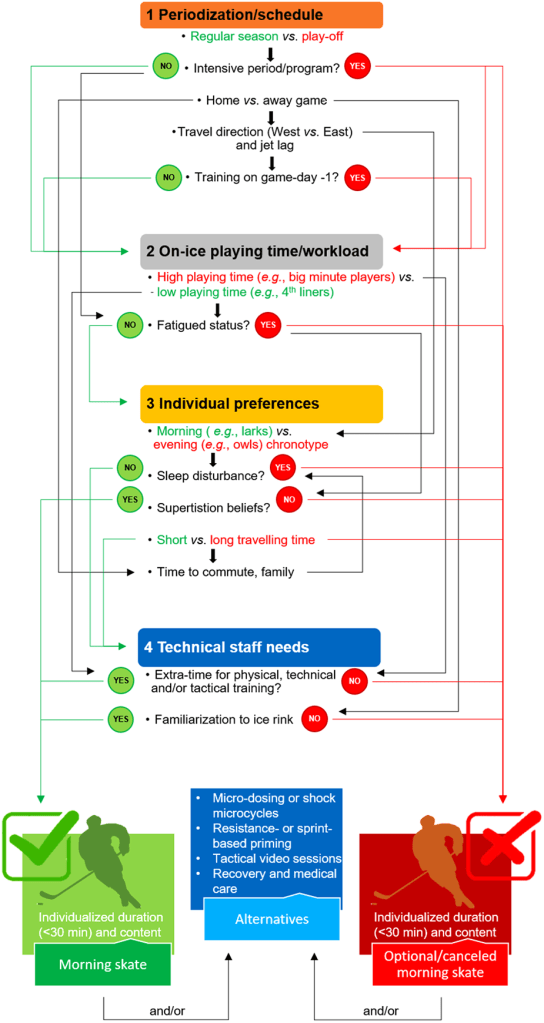 Figure 1. “Decision tree for the implementation of morning skate. Green text and arrows refer to a positive weight (or effect); red text and arrows refer to a negative weight (or effect); black arrows branch off into other possible factors.” Adopted from Brocherie and Perez (2023).3 (CC BY 4.0).